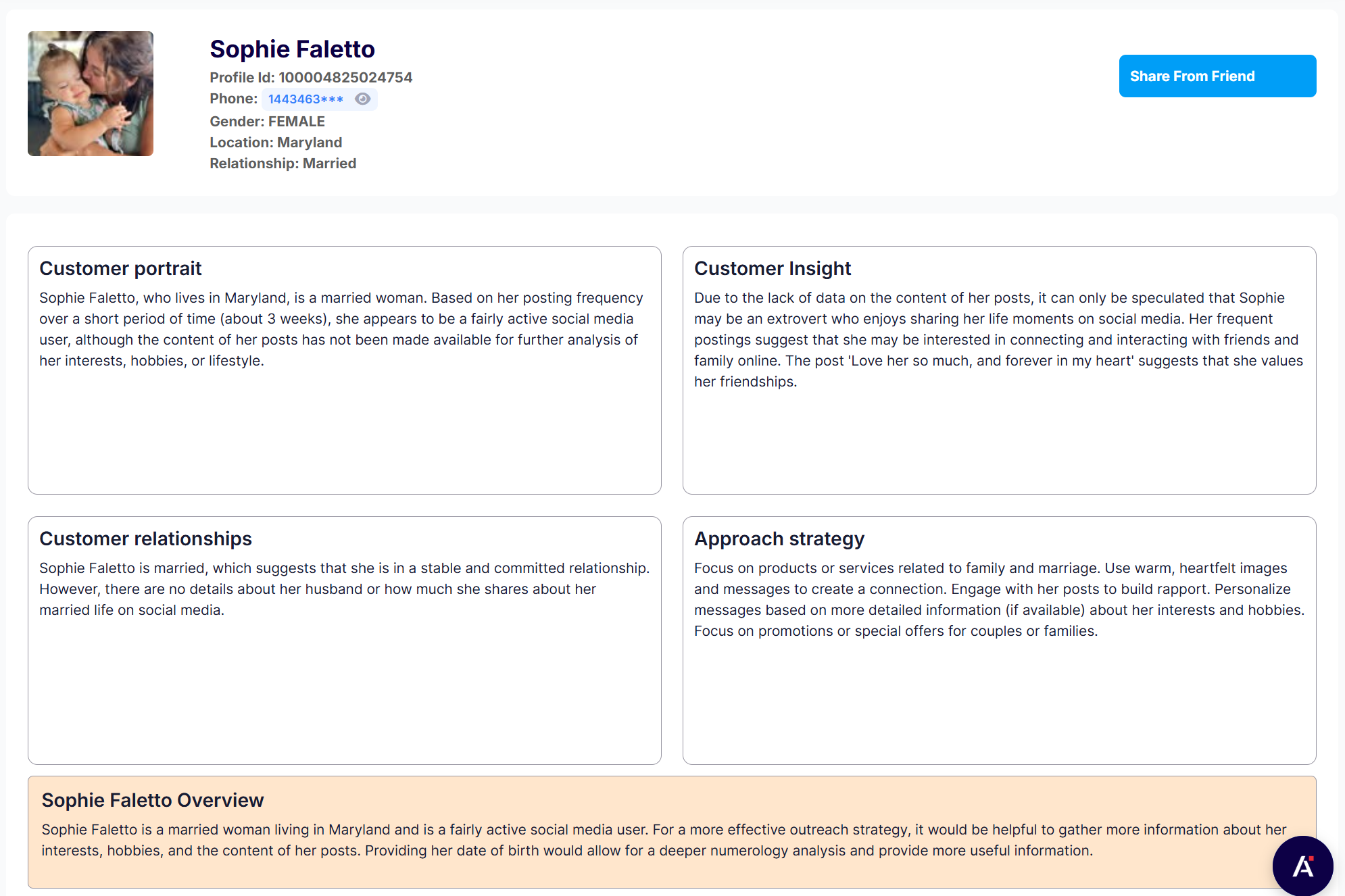 The AI model is built on social data from over 350M profiles, enabling deep analysis of customer personas and insights — including numerology and zodiac indicators. It then suggests the most effective strategies to engage each user.