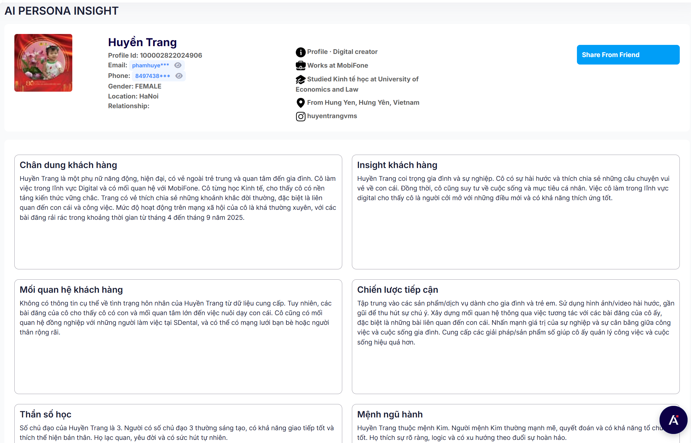 Tùy thuộc vào mức độ public data của user trên Social, hệ thống cung cấp các thông tin về tình trạng hôn nhân, học vấn, sở thích