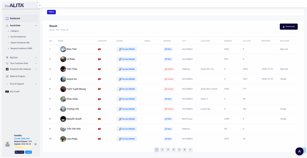 theAlita sẽ tự động map dữ liệu từ CRM với kho Social Big Data khổng lồ, nơi tập trung hàng triệu hồ sơ hành vi từ mạng xã hội, fanpage, group cộng đồng.